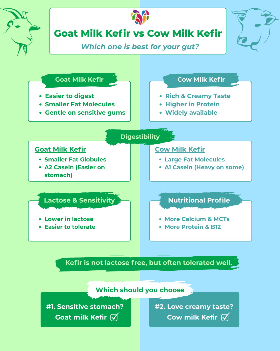 Compare goat and cow milk kefir. Designed to help you choose the best option for digestion, tolerance, and gut comfort.