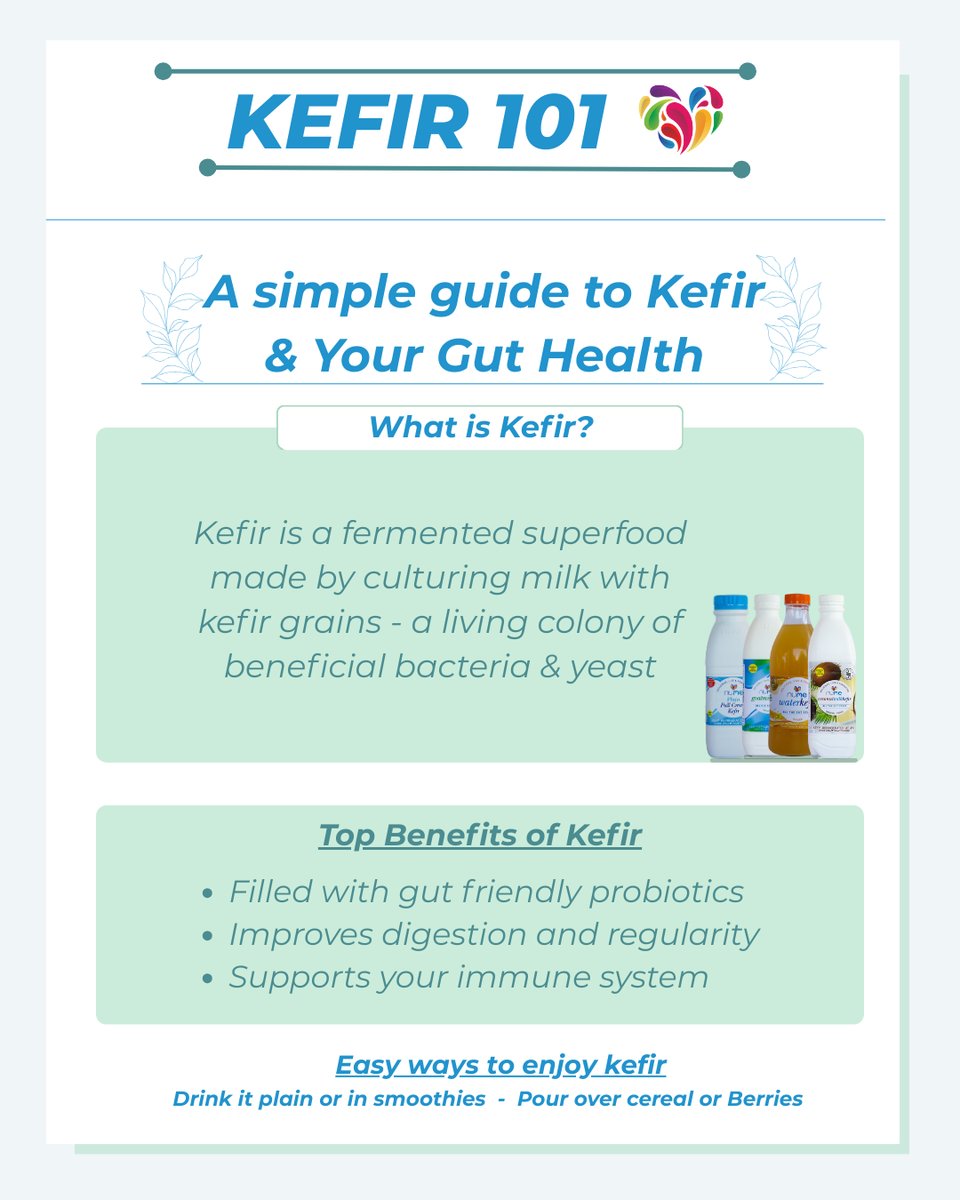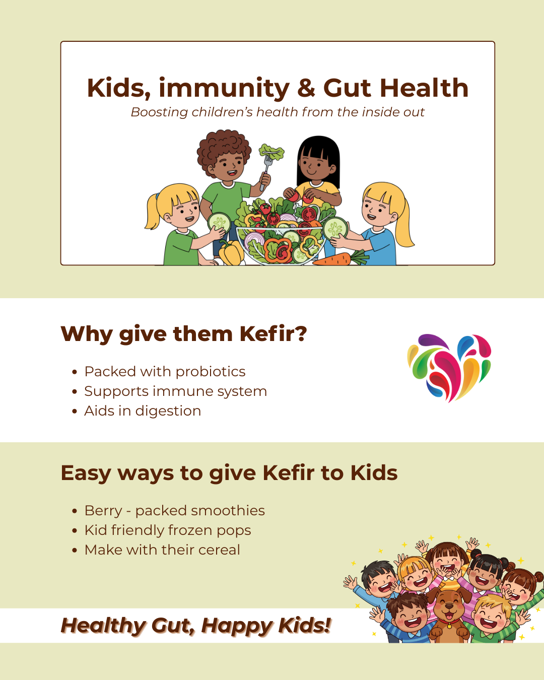 Support children’s gut and immune health. Designed to explain kefir benefits, safety, and easy ways for kids to enjoy it.